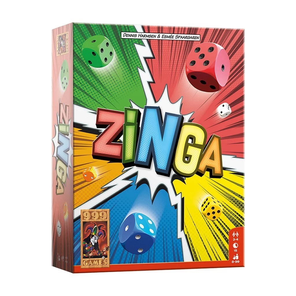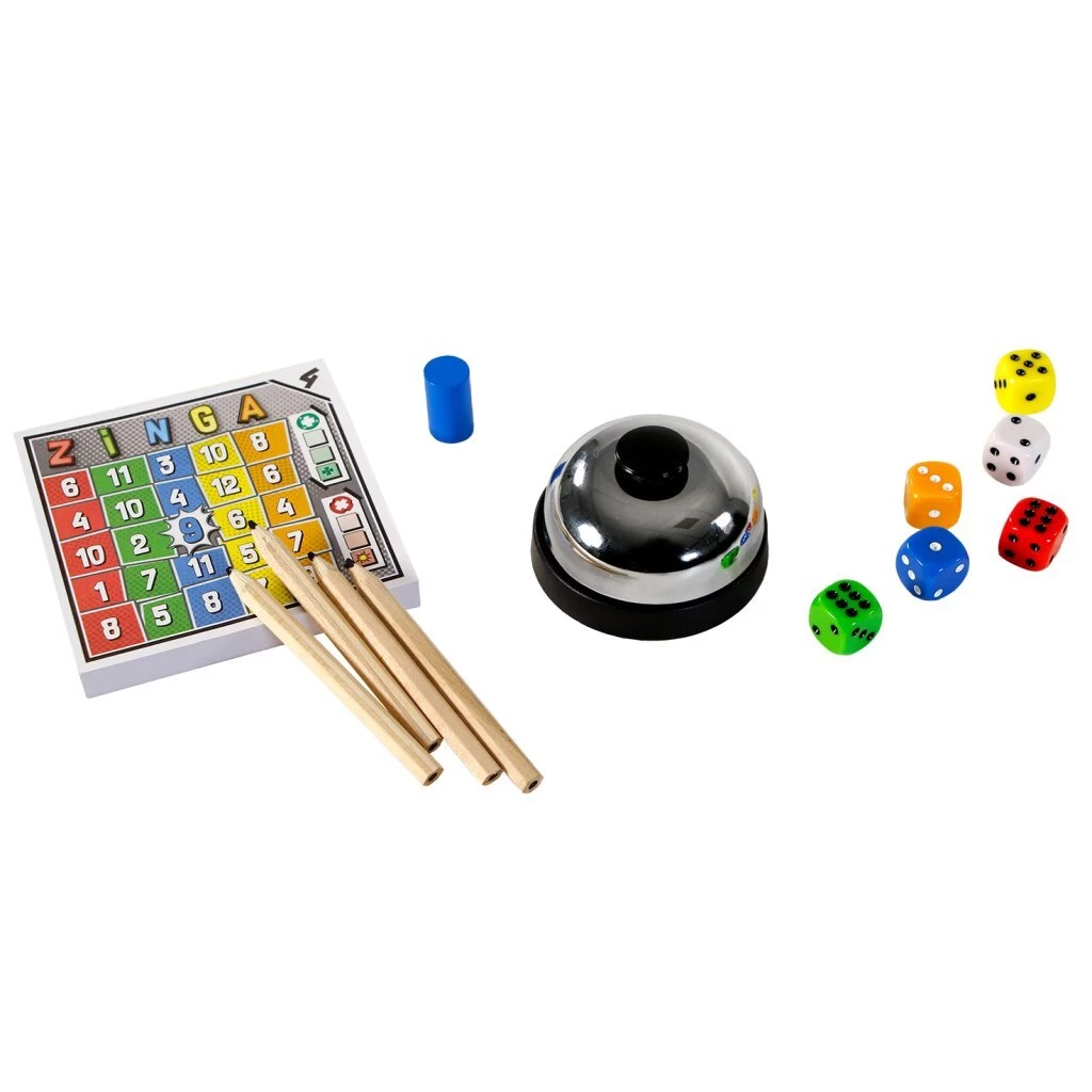 Rol met de dobbelstenen, zoek zo snel mogelijk naar de juiste combinatie van kleur en getal en sla op de bel. Als je geen fouten hebt gemaakt, mag je de combinatie op je scorevel afstrepen. Zodra je een kolom of rij van 5 combinaties hebt afgestreept, roep je ZINGA! en win je het spel. Zinga is een vrolijk dobbelspel, waarbij roll & write wordt gecombineerd met een reactiespel. Om te winnen moet je snel zijn, maar kijk uit voor fouten! Een combinatie noemen die niet bestaat, te lang wachten met iets noemen of jezelf herstellen na een verspreking wordt al gezien als een fout. Zinga is heel simpel, maar heeft ook wat ruimte voor tactiek. Zo kun je met de combinatie BLAUW NEGEN de blauwe pion inzetten, waarmee je andermans beurt kunt stoppen of eenmalig een eigen fout kunt negeren. Ook kun je ervoor kiezen om eerder afgestreepte combinaties nog eens te noemen. Doe je dit voor de derde keer, dan mag je een vakje naar keuze afstrepen.