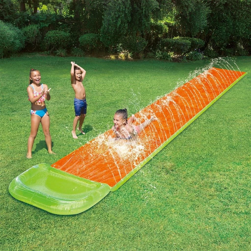 Creëer een waterparadijs in je eigen tuin met deze waterglijbaan. Rol de ruim 549 cm lange glijbaan op een geschikte plek uit. Zet hem vast en laat hem vol lopen met de tuinslang. Zodra het water over de baan heen loopt vanuit de sproeiers in de zijkanten is het tijd om te glijden. Afmeting: 549 x 79 cm. Kleur: oranje/groen. De glijbaan is geschikt voor kinderen vanaf 3 jaar.