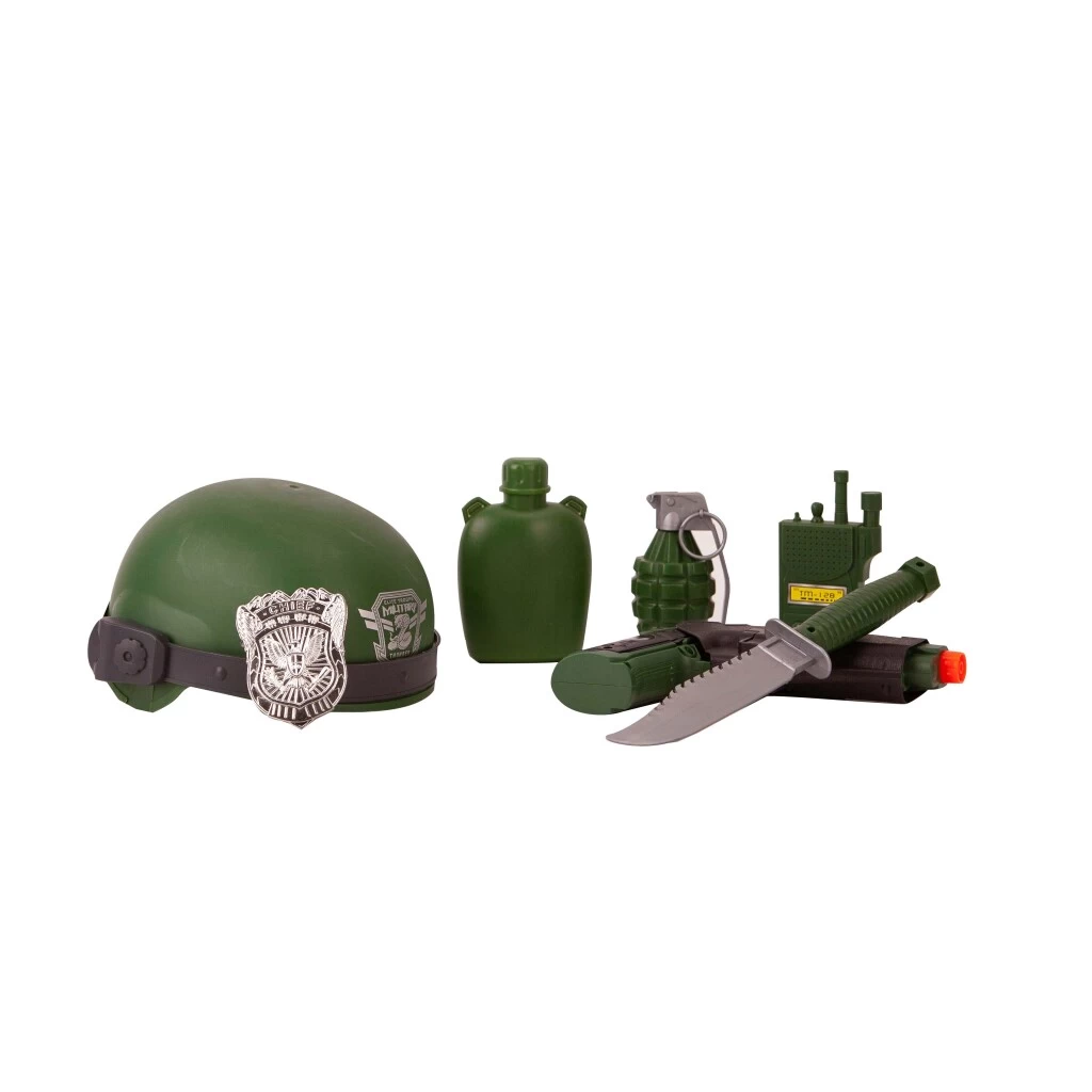 Met deze soldaten speelset kunnen kinderen spelen alsof ze soldaat zijn. Het setje bestaat uit een helm, badge, walkie talkie, mes, pistool, waterfles en een handgranaat. Geschikt voor kinderen vanaf 4 jaar.