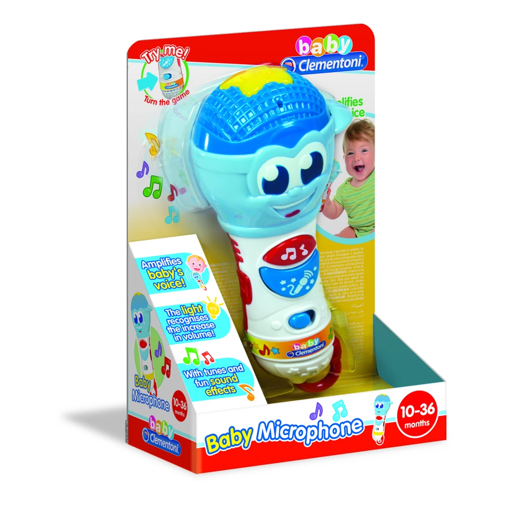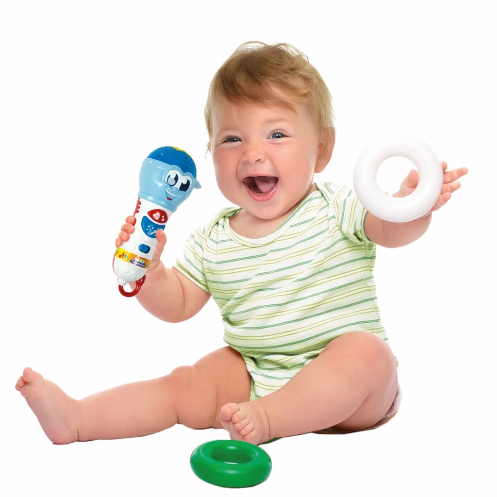 Deze leuke microfoon begeleidt de kinderen bij hun eerste kennismaking met liedjes zingen. Deze microfoon bevat een Led licht, 2 gekleurde sleutels en een heleboel melodieën en leuke geluidseffecten. Met een simpele druk op de toets kan je het geluid van je stem versterken net als in een echte microfoon, het licht wordt sterker bij een hogere toon van de stem. Geschikt voor kinderen vanaf 10 maanden.