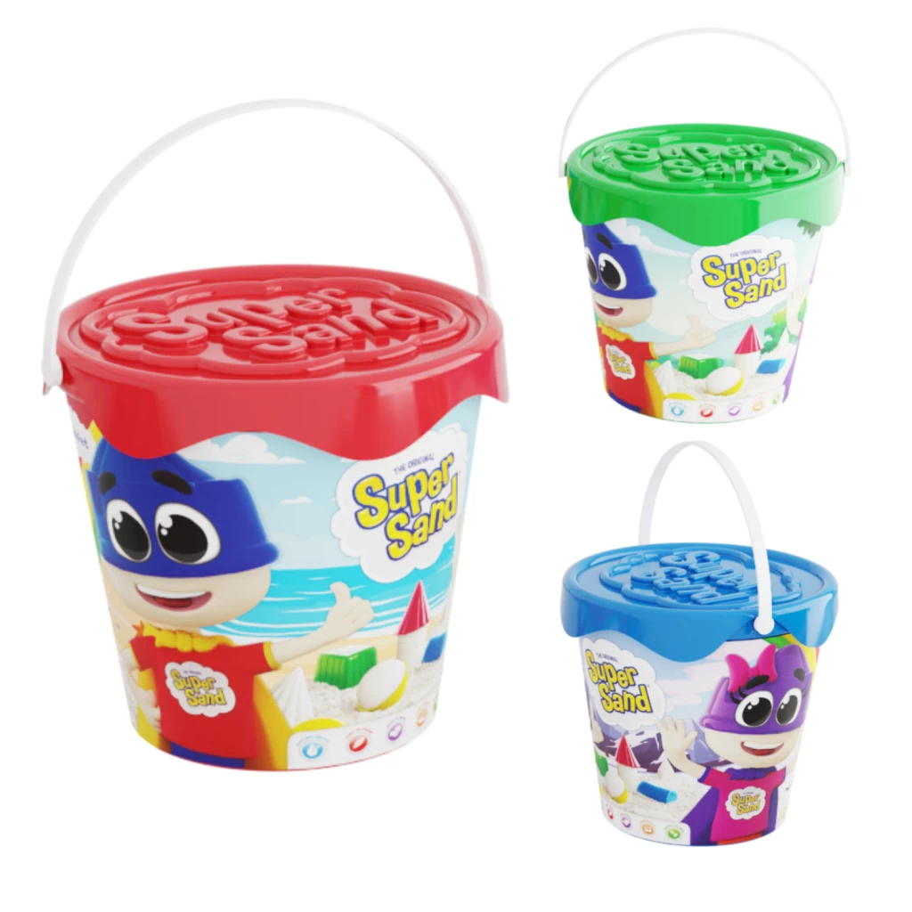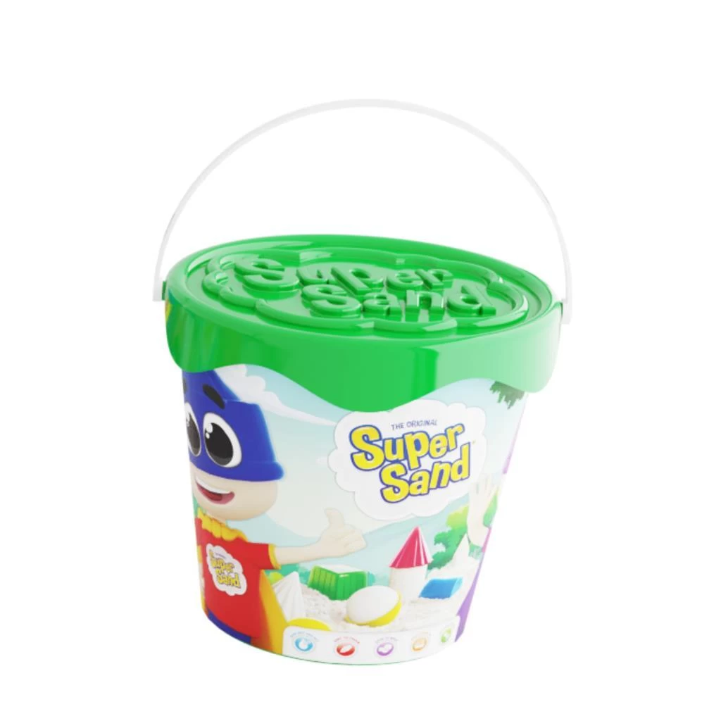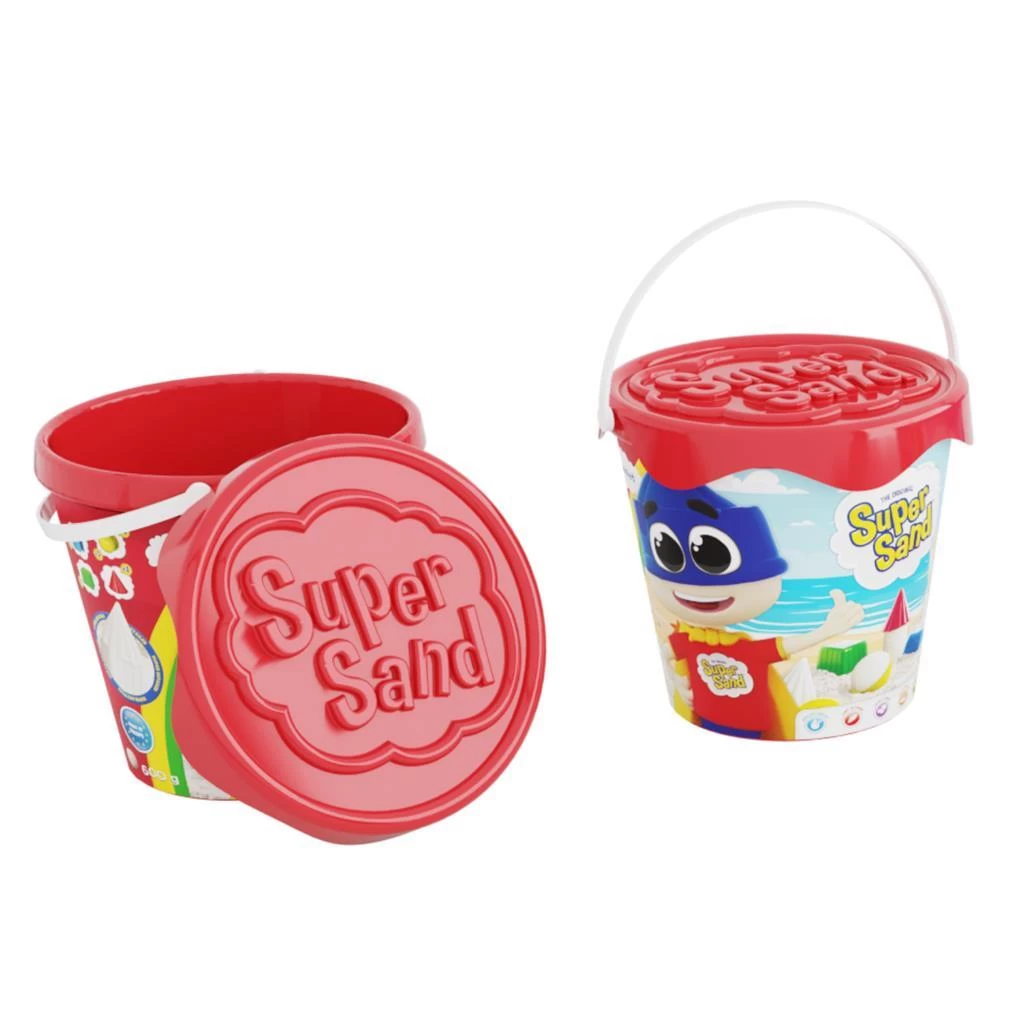 Emmer met 600 gram zand. 300 gram is wit zand, de andere 300 gram is gekleurd zand. Verkrijgbaar in verschillende kleuren, vooraf is niet te bepalen welke je zult ontvangen. Geschikt voor kinderen vanaf 3 jaar.