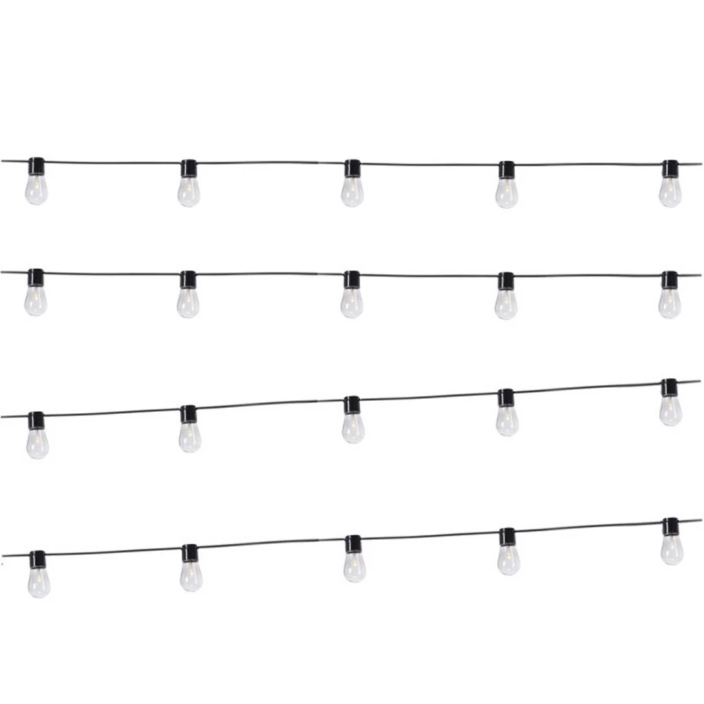 14,5 meter lichtsnoer met 20 LEDs die warm-wit licht geven. Geschikt voor gebruik buitenshuis. Het totale lampensnoer is 9,5 meter land, met 50 cm tussen de lampen. Het stekkersnoer is een halve meter lang.