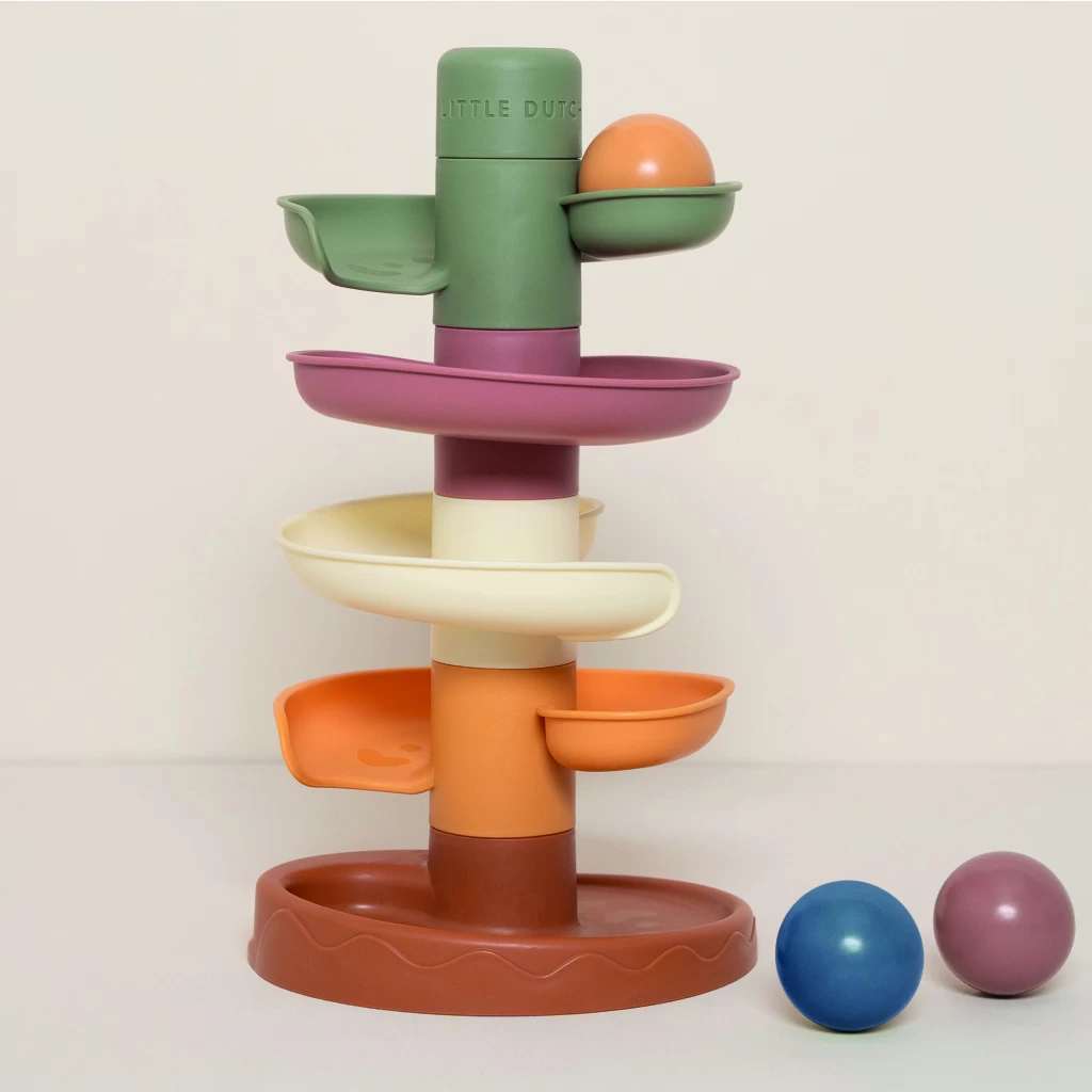 Laat de bal maar rollen! De vintage spiraaltoren van Little Dutch zorgt voor eindeloos veel speelplezier. Deze kleurrijke set bestaat uit 5 herkenbare gekleurde delen die jouw kleintje gemakkelijk op elkaar stapelt. Laat de ballen één voor één op de bovenste laag vallen en kijk hoe ze achter elkaar naar beneden rollen en slingeren. De spiraaltoren draagt bij aan de ontwikkeling van de hand-oog coördinatie en leert kleintjes over oorzaak en gevolg, waarmee het zowel leuk als leerzaam spelen is. Bij de spiraaltoren zitten standaard 3 lichte en gemakkelijk vast te pakken ballen in verschillende kleuren die bij beweging een geluidje maken. Dit speelgoed is uitgevoerd in de super trendy Little Dutch retro kleuren. De afmeting is: 18 x 18 x 30 cm. Geschikt voor kinderen vanaf 18 maanden.