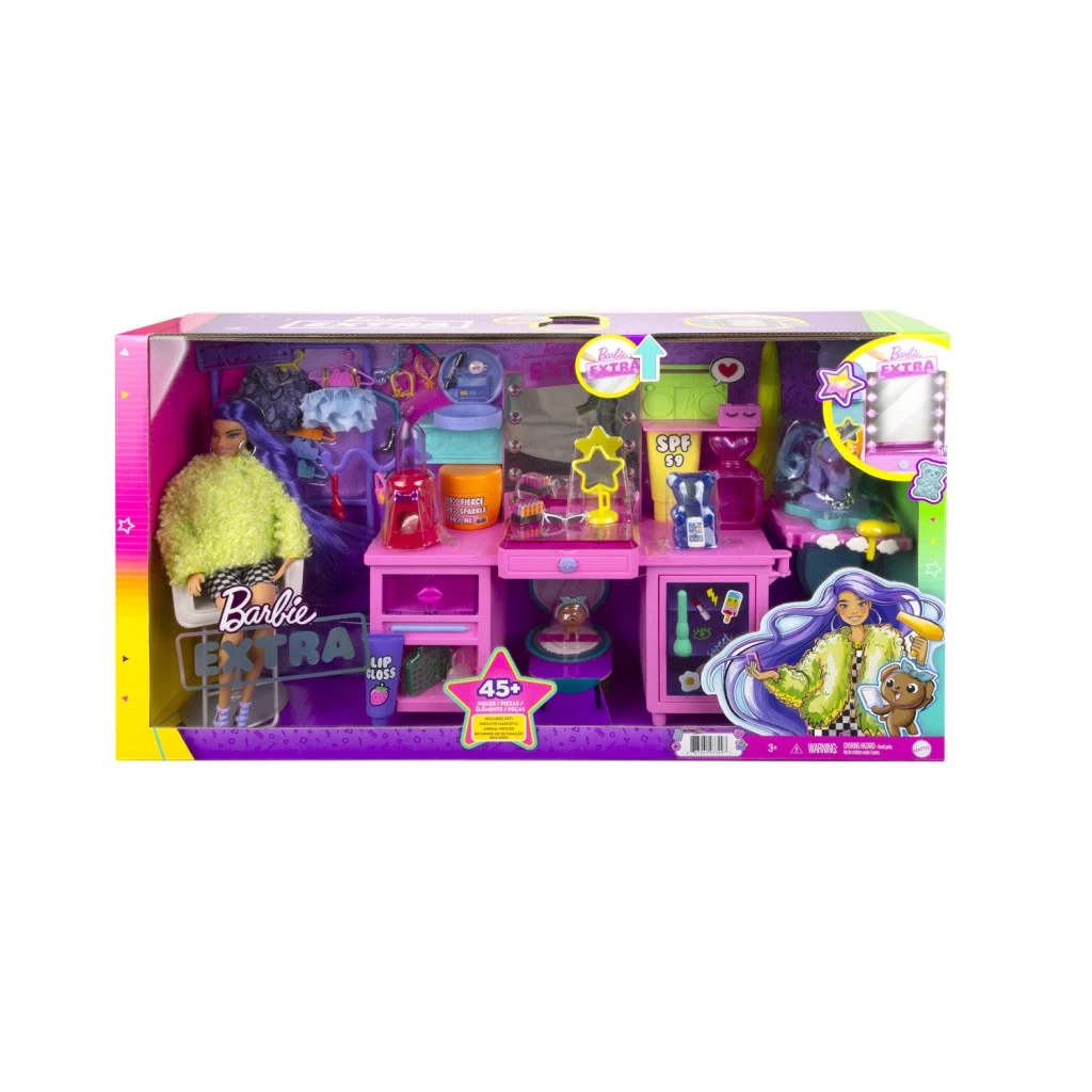 De Barbie Extra Vanity Speelset staat garant voor uren speelplezier met kaptafel, kledingrek, stoel, diverse outfits en accessoires. De lampjes van de kaptafel geven licht. 45-delig. Geschikt voor kinderen vanaf 3 jaar.