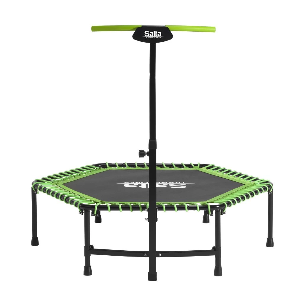 Deze professionele trampoline is bij uitstek geschikt voor gevorderden, maar evenwel voor de beginnende gebruiker. De beginners kunnen met de meegeleverde beugel extra stabiliteit en ondersteuning ervaren, en voor gevorderden is de beugel toepasbaar voor geavanceerde work-outs.De Fitness trampoline heeft een afmeting van maar liefst 128 cm, waardoor alle work-outs en trainingen fitness oefeningen effectief kunnen worden uitgevoerd. Doordat de elastieken vering optimaal en comfortabel is afgesteld, kan er geluidloos worden gesprongen en is springen niet belastend voor de rug en gewrichten. Hierdoor train je verantwoord alle spieren om je conditie en uithoudingsvermogen te verbeteren.De Salta Fitness trampoline is zodanig ontworpen dat de constructie een zeer solide en robuuste geheel vormt. De beugel is eenvoudig verstelbaar in 5 verschillende standen voor iedere gewenste hoogte.De fitness trampoline is veilig te gebruiken met en zonder beugel vanwege het bijgeleverde frame. De trampoline is uitvoerig getest voor 110kg maximum gewicht en geschikt voor commercieel, openbaar en uiteraard thuisgebruik.