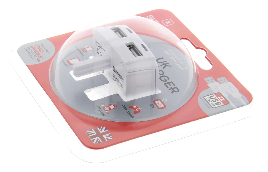 The UK USB Charger quickly and simultaneously charges two USB devices. Its high power output is ideal to charge smartphones, tablets or any other USB device.