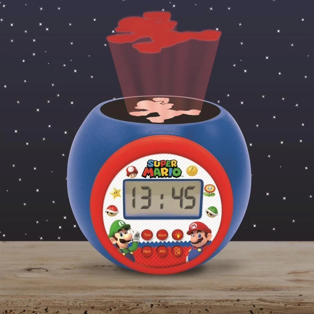 Super Mario rood-blauwe projector wekkermet alarm-functie en snooze-functie. Projecteert een afbeelding van Mario in 3 verschillende kleuren licht.