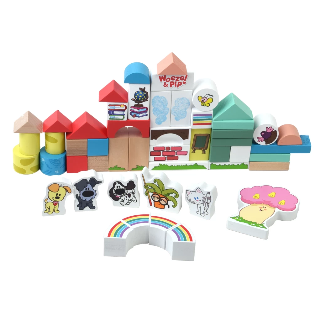 Met deze leuke blokkenset van Woezel en Pip kun je de mooiste dingen bouwen! Stapel de blokjes op elkaar of zet ze tegen elkaar aan en maak de mooiste bouwwerken. Deze set bevat 50 houten vrolijk gekleurde blokken in verschillende kleuren en vormen, in de herkenbare stijl van Woezel en Pip!
